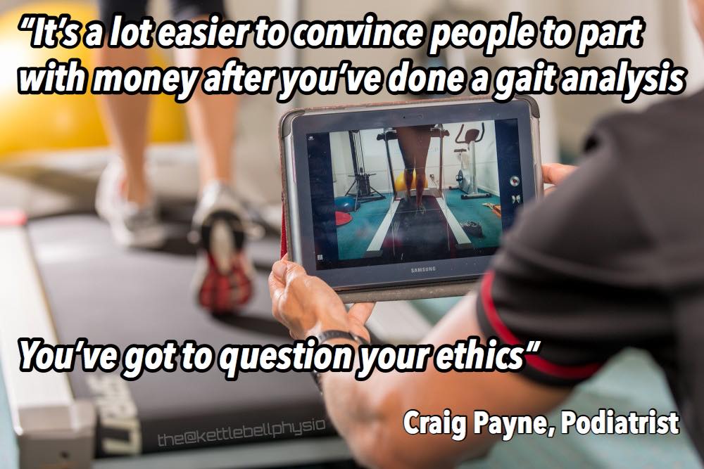 There are lots of gait systems that come with all sorts of ‘bells and whistles’ and produce pretty pictures that can really impress people. If another health professional down the road from you has one of those, their patients are probably going to be more impressed than your patients. That is going to put you at a competitive disadvantage and puts them in a position to convince people to more easily part with money for whatever intervention they are recommending. This still comes down to ethics. Was their clinical decision-making process as to the intervention altered by the ‘bell and whistles’? Probably not. I am sure you can see the ethical issue.