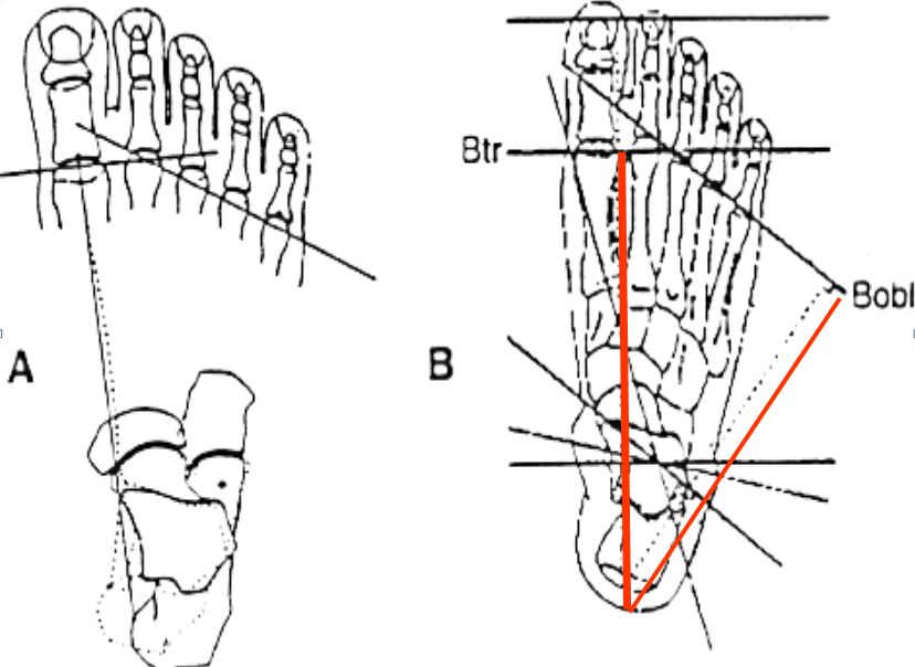 I will get back to the Airia shoe, but firstly what Finn Bojsen-Møller proposed in 1979 was a theoretical model or framework that has what I think are good explanatory powers to interpret foot biomechanics and research on foot biomechanics (and for our purpose here, how the Airia shoe might influence permanence). Basically what he proposed was that there are two axes across the metatarsal heads: the transverse axis across the 1st and 2nd metatarsal heads and the oblique axis across metatarsal heads 2 to 5 (see diagram A below from his paper). Obviously, the angulation of those two axes will vary from person to person depending on the relative length of the metatarsals (add this variation into the mix of anatomical variations that I talked about  in the why one size does not fit all when it comes to running post.)