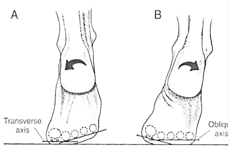 The diagram below is taken from Bojsen-Møller’s original 1979 paper and gives a theoretical look at the two different modes of propulsion using either of the two axes. For our purposes here, ignore the rearfoot  as this is not really related to a pronated or supinated position of the rearfoot.